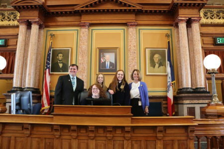 On Tuesday, Rep. Ann Meyer, R-Fort Dodge, welcomed members of the Fort Dodge FFA chapter to the Iowa House during the FFA Legislative Symposium. From left are FFA advisor Ben Hennessy, Grace Winkel (seated), Paige Lloyd, Claire Thompson and Meyer.