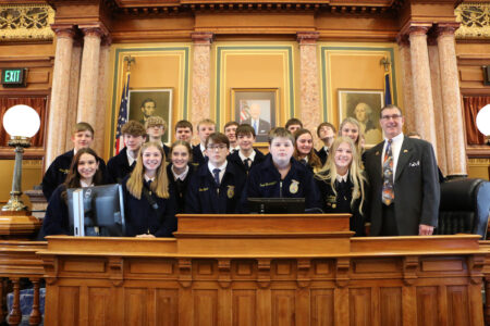State Rep. Mike Sexton, R-Rockwell City, welcomed members of the Manson Northwest Webster, Pilot Creek, and South Central Calhoun FFA chapters to the Iowa House Tuesday during the FFA Legislative Symposium.