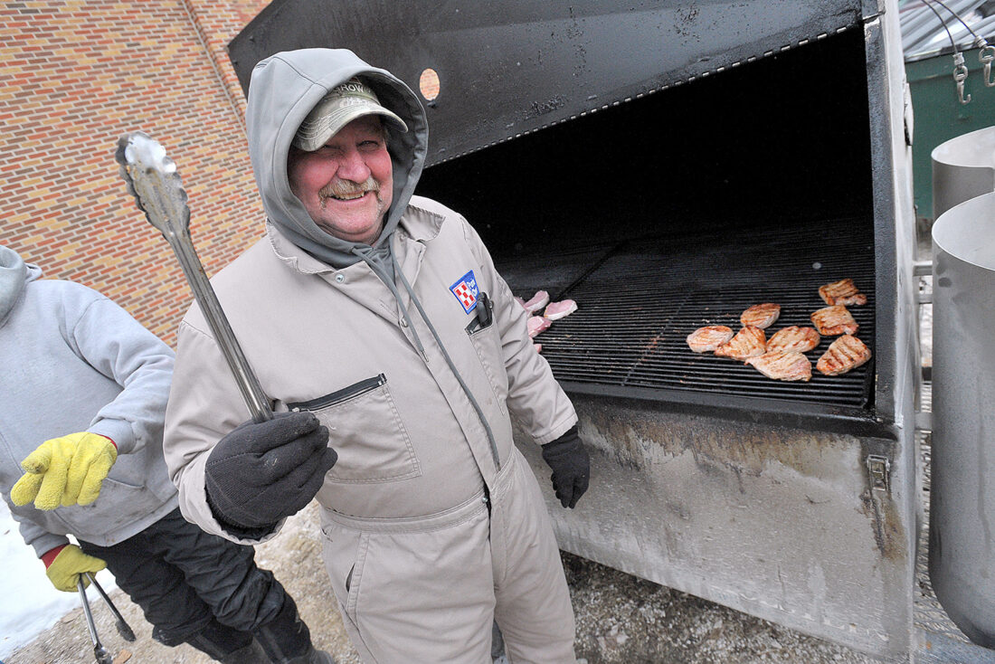 Keith Streit, of Gowrie, demonstrates the proper attire for grilling in 20-degree weather, and with a much lower windchill at the 2023 Dayton Expo. Streit is with the Webster County Pork Producers, who helped prepare lunch for the event.
