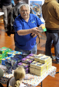 Dan Hofschulte, of Lansing, is all smiles after picking up a couple of boxes of Girl Scout cookies at the 2023 Dayton Expo. Hofschulte is the co-owner of Tear Bear Mobile, which was also an exhibitor at the annual event.