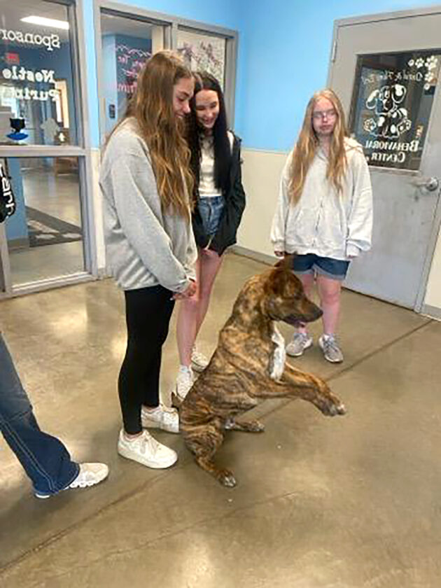A group of middle school students plays with a dog at the Almost Home Humane Society of North Central Iowa last week. Students from the Southeast Valley and Webster City middle schools spent some time volunteering at the Fort Dodge shelter.