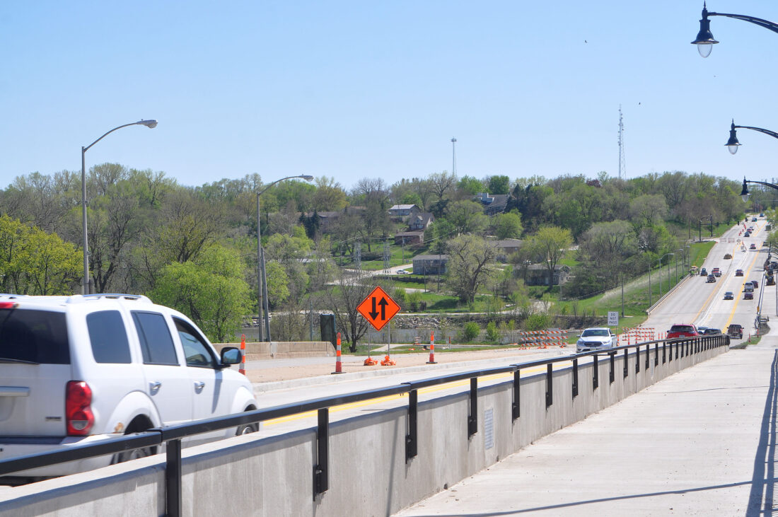 Traffic is seen moving in both directions Monday afternoon on the westbound lanes of the Kenyon Road bridge near South Eighth Street. Eastbound traffic has been shifted onto the recently built westbound lanes so that paving and joint replacement work can be done on the eastbound side.