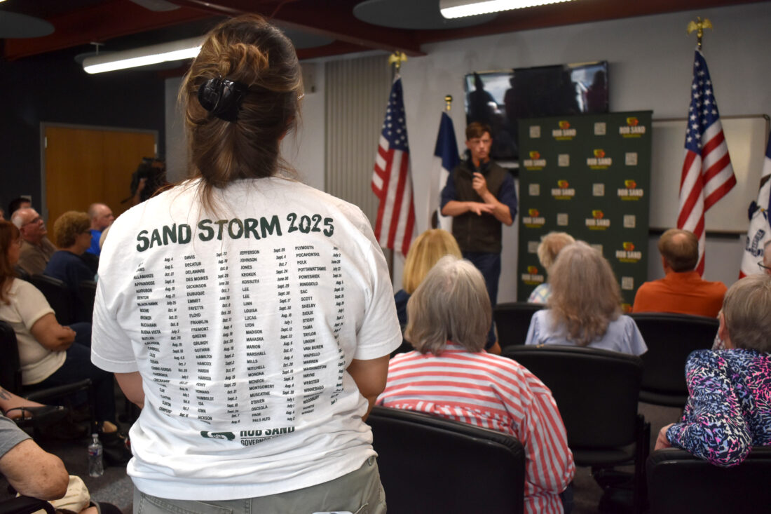 The back of a Rob Sand staffer’s T-shirt maps out his 99 county tour, which stopped in Webster City Tuesday at Fuller Hall. Sand, Iowa’s state auditor and a Democrat, is running for governor to fill the seat of Republican Gov. Kim Reynolds. Reynolds announced earlier this year that she will not seek another term.