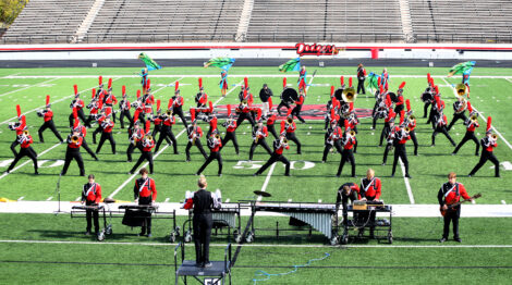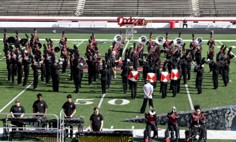 The Algona Marching Band performs during State Band Festival on Saturday inside Dodger Stadium.