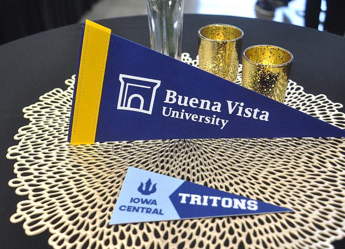 Small pennants from Iowa Central Community College and Buena Vista University were displayed Tuesday afternoon in the Art and Technology Building at Iowa Central’s Fort Dodge campus during an event marking the 50th anniversary of a partnership between Iowa Central and Buena Vista University.