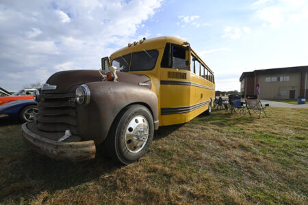 Andrew and Jill Carlson, of Manson, showcase a 1949 school bus during Cruise to the Woods on Sunday at Lizard Creek Ranch.