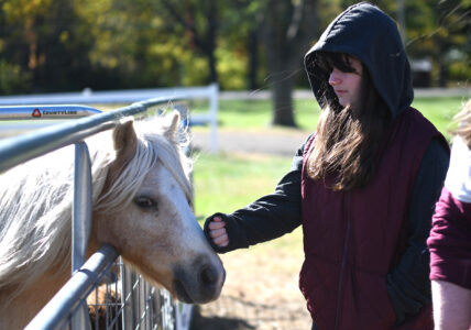 Emma Elder, 12, of Eldon, pets a pony at The Community Orchard Sunday during Apple Fest.