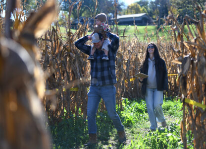 Oliver Folcher, of Webster City, carries his son Addison Folcher, 20 months, through a corn maze with his wife Caitlin Folcher walking behind at The Community Orchard on Sunday during Apple Fest.