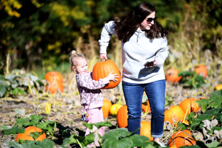 Miley Brown, 4, helps her mother Chelsea Brown, of Fonda, carry a pumpkin at The Community Orchard on Sunday during Apple Fest.