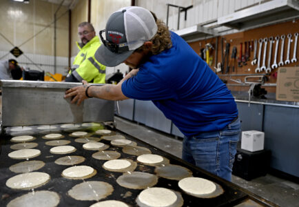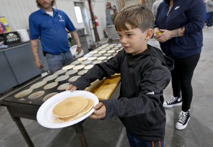 Tony Klave, of Pocahontas, serves pancakes during the Fall Fly-in flights and pancakes breakfast on Saturday at the Fort Dodge Regional Airport.