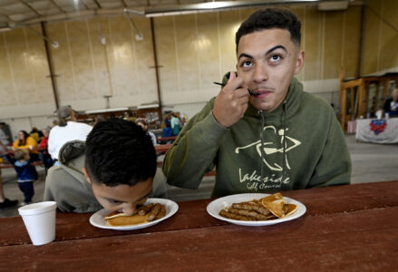 Anthony Newson Jr., 18, of Fort Dodge, right, and his brother Antonyo Newsome, 9, of Fort Dodge, enjoy a plate full of pancakes before getting on a plane during the Fall Fly-in flights and pancakes breakfast on Saturday at the Fort Dodge Regional Airport.