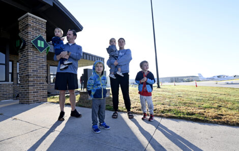 Pictured from left, Eli Hora, 2, Joe Hora, Aiden Hora, 4, Thomas Hora, 2, Meg Hora, and Matthew Hora, all of Fort Dodge, watch planes take off during the Fall Fly-in flights and pancakes breakfast on Saturday at the Fort Dodge Regional Airport.