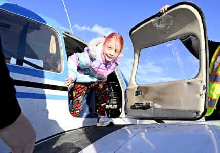 Lydia Stough, 7, of Humboldt, gets out of a plane after flying around Fort Dodge during the Fall Fly-in flights and pancakes breakfast on Saturday at the Fort Dodge Regional Airport.