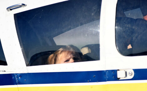 Kannon Higgins, 9, of Gowrie, sits in the front of the plane during the Fall Fly-in flights and pancakes breakfast on Saturday at the Fort Dodge Regional Airport.