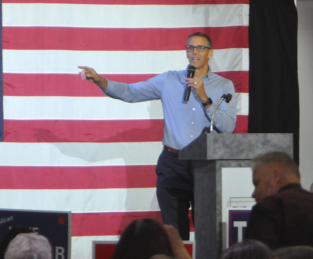 U.S. Rep. Randy Feenstra, R-Hull, addresses local Republicans Monday night at the Ken and Jane Rasch Chili Feed. He is seeking the Republican nomination for governor, but he focused on national issues in his remarks.
