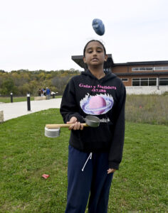 Rudhula Palanivel, 13, of West Des Moines, plays an ancient Native American game during Ancient Techologies Day at Matt Cosgrove River’s Edge Discovery Center.