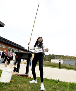 Akshara Sivakumaran, 13, of West Des Moines, throws an atlatl at a target during Ancient Techologies Day at Matt Cosgrove River’s Edge Discovery Center.