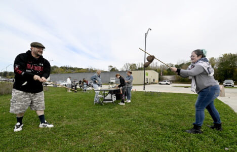 Kevin Souder, of Fort Dodge, left, and Annie Canning, of Fort Dodge, plays an ancient Native American lacrosse game during Ancient Techologies Day at Matt Cosgrove River’s Edge Discovery Center.