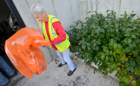 -Messenger photo by Hans Madsen Volunteer Roberta Bochtler, of Fort Dodge, opens up her trash bag as she prepares to hit the trail Saturday morning during a Webster County Conservation Trail Cleanup.