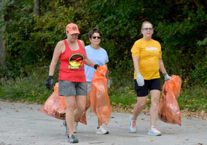 After a short while on the trails, Melissa Nanninga, at left, Susan Doyle and Carol Breeser, all had plenty of litter and junk in their bags Saturday morning during a Webster County Conservation Trail Cleanup. The trio was working in Loomis Park.