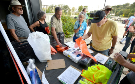 Volunteer Jim Stephenson, of Fort Dodge, selects a trash bag Saturday morning as he prepares to head out during a Webster County Conservation Trail Cleanup.