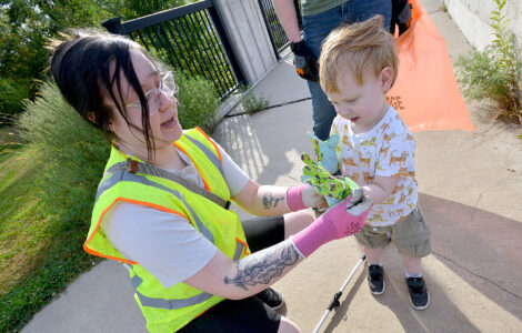 Toby Williams, 2, of Fort Dodge, gets a little help with his colorful gardening gloves Saturday morning as he hits the trail with his mom, Sydney Williams, at left, during a Webster County Conservation Trail Cleanup. His dad, Kris Williams, holds onto the garbage bag they’ll be filling up with litter.