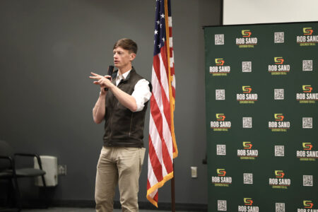 About 120 people gathered to hear him in the Bioscience and Health Sciences Building at Iowa Central Community College. When Sand asked for a show of hands, it was revealed that the audience included Democrats, Republicans and Independents.