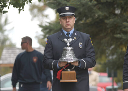 Jason Reynolds, a firefighter and paramedic with the Fort Dodge Fire Department, carries the bell signaling “the final call” in honor of Woodward “Woody” Wolfe, former assistant Fort Dodge fire chief, during Wolfe’s funeral service at Terry Moehnke Veterans Memorial Park Saturday in Fort Dodge.