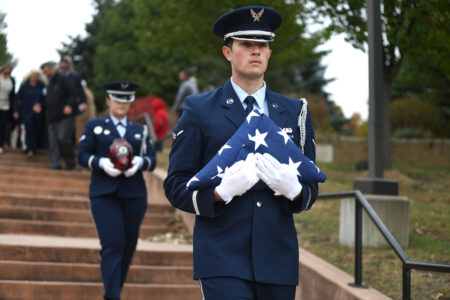 Members of the U.S. Air Force Honor Guard carry the urn and American flag during Woodward “Woody” Wolfe’s Celebration of Life Saturday at Terry Moehnke Veterans Memorial Park in Fort Dodge.