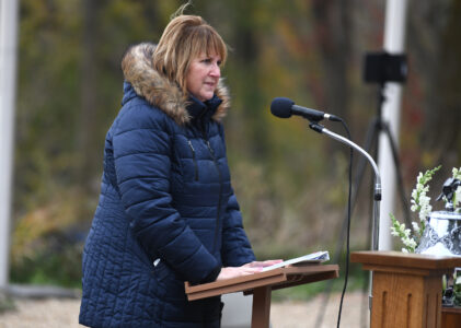 Sue Skramstad, of Fort Dodge, officiates at the funeral of Woodward “Woody” Wolfe, former assistant Fort Dodge fire chief, on Saturday at Terry Moehnke Veterans Memorial Park in Fort Dodge.
