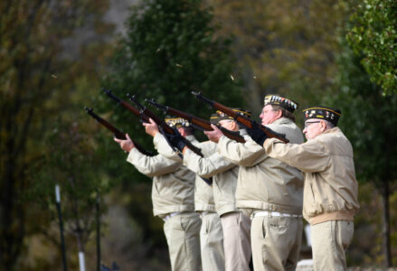 Members of VFW Post 1856 conducted military rites at the funeral for Woodward “Woody” Wolfe, former assistant fire chief for the Fort Dodge Fire Department who retired from the department in 2014. Here they fire the traditional three-volley salute in Wolfe’s honor.