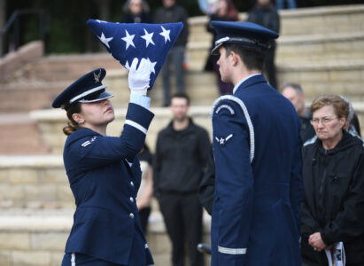 The American flag is folded before being presented to Woodward “Woody” Wolfe’s family during his Celebration of Life on Saturday at Terry Moehnke Veterans Memorial Park in Fort Dodge. Wolfe, of Spirit Lake and formerly of Fort Dodge, was a former assistant fire chief with the Fort Dodge Fire Department.