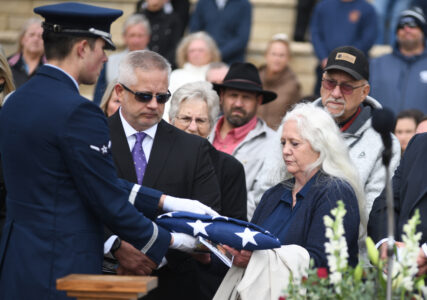 Laura Wolfe, of Spirit Lake, receives a flag in honor of Woodward “Woody” Wolfe during his funeral on Saturday at Terry Moehnke Veterans Memorial Park in Fort Dodge. “Woody” Wolfe was a former firefighter in the United States Air Force as well as the Fort Dodge Fire Department.