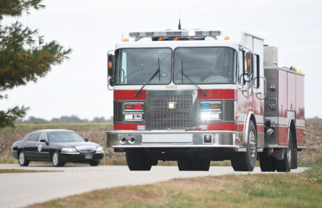 A Fort Dodge fire truck makes its way toward Terry Moehnke Veterans Memorial Park during a funeral procession honoring former assistant Fort Dodge fire chief, Woodward “Woody” Wolfe, Saturday in Fort Dodge.
