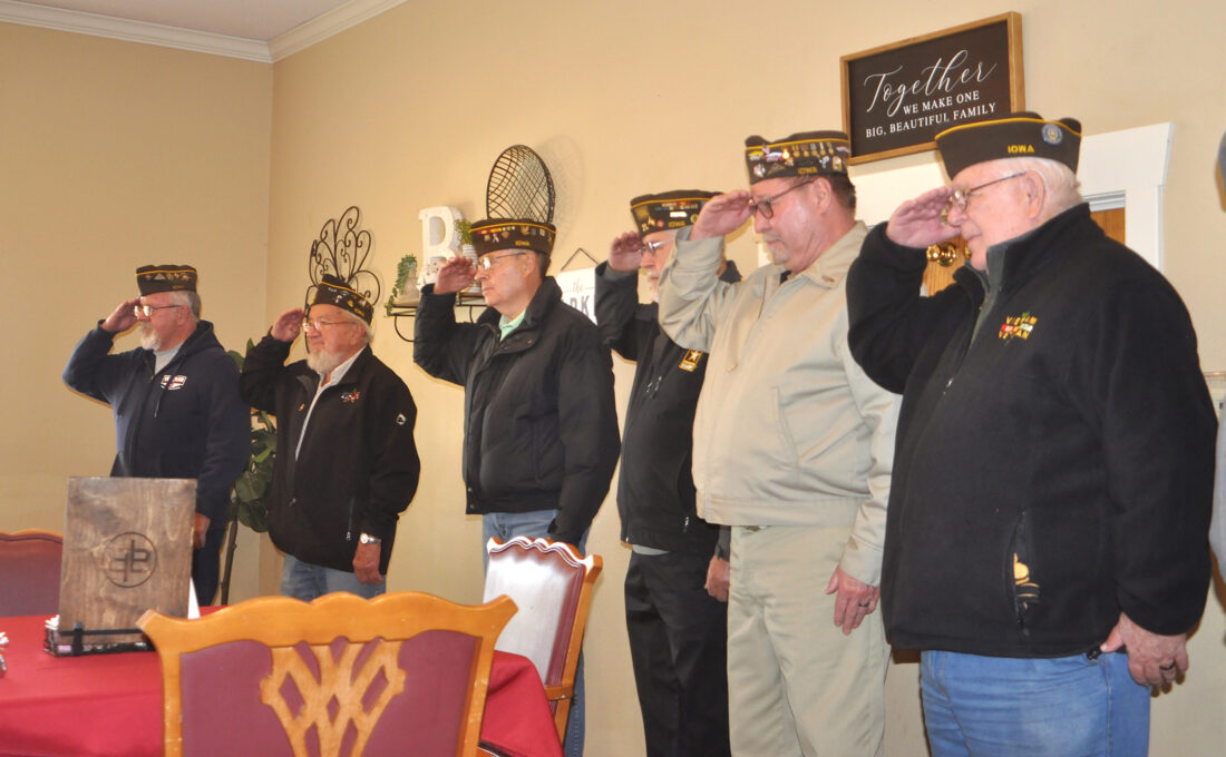 Members of Veterans of Foreign Wars Post 1856 of Fort Dodge salute World War II Navy veteran Glenn Cue Monday afternoon during an event honoring him.