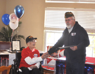 Bill Mader, also representing VFW Post 1856, presented him with a crisp new cap with “World War II Veteran” printed on its front.