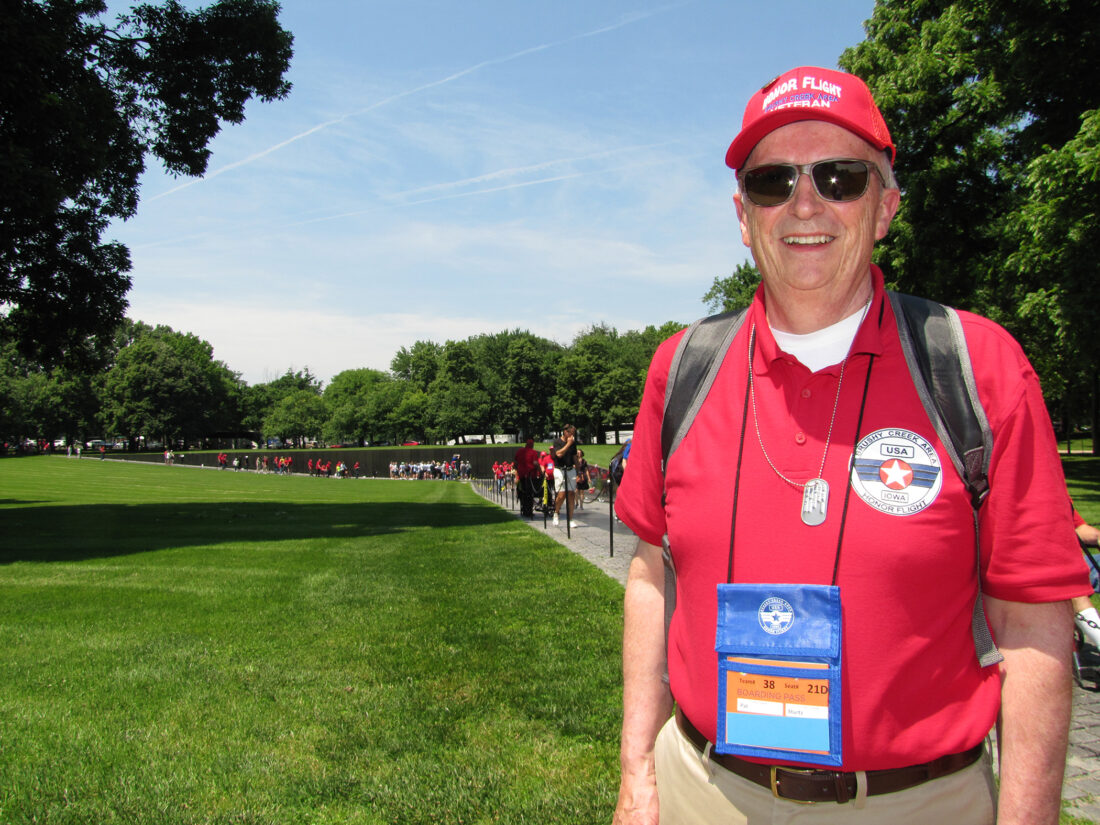 U.S. Army veteran Pat Sturtz with the Vietnam War Memorial behind him during a 2024 Honor Flight.