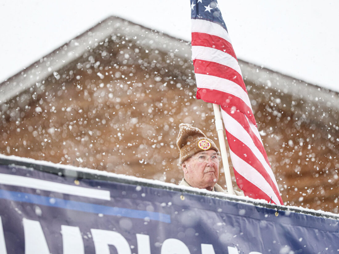Tom Dorsey, of Fort Dodge American Legion Post 130, holds the American flag during the NJCAA national cross country championships at Lakeside Golf Course inside John F. Kennedy Memorial Park on Saturday.