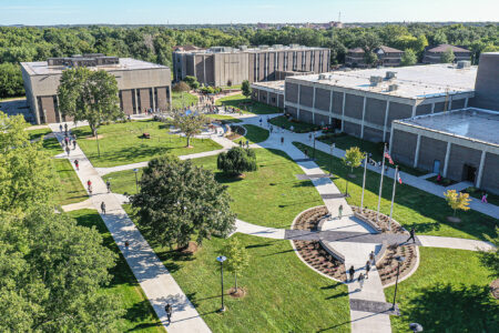 The Iowa Central Community College courtyard is seen in this aerial view on the first day of the fall semester. On Tuesday, voters in the nine county area served by the college approved an extension of an existing bond issue that will fund improvements at the college.