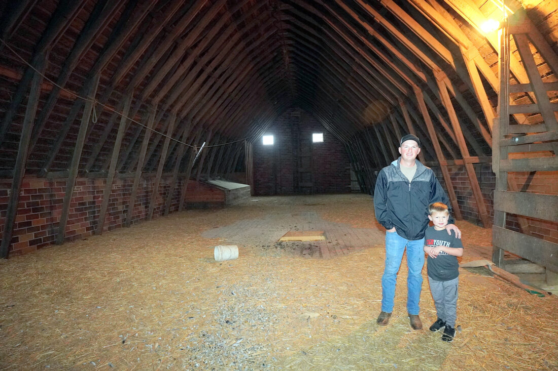 Austin Keller and his son Harrison stand in the barn’s haymow that long ago stored hay bales.