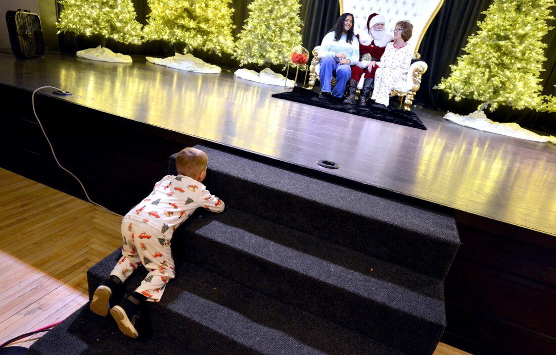 Braxton Richardson, 4, of Des Moines, tries to sneak up on Santa Saturday while attending the Operation Ornament fundraiser at the Laramar Ballroom in Fort Dodge. The event, organized by Swingin’ Fore Soldiers, was intended to raise money for veterans in need.