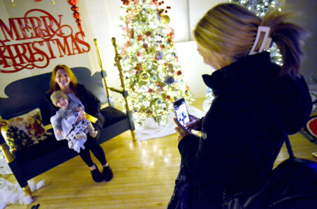 Megan Thielen, of Fort Dodge, at right, films Casey Posey, of Fort Dodge, and her son, Dennis Osborne, 9 months, at the Operation Ornament fundraiser Saturday at the Laramar Ballroom in Fort Dodge.