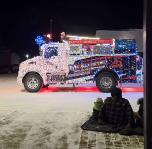 -Submitted photos by Emily Meyer Manson’s second annual Lighted Christmas Parade makes its way down Main Street Saturday night in Manson. Several busineses entered the parade, including “Santa’s Mobile Service” by McAllister Welding Services.
