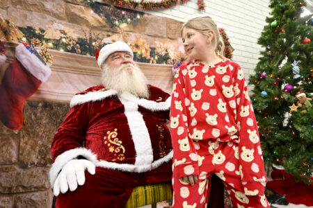 Payslee Patterson, 9, of Duncombe, tells Buddy Swanson (Santa), of Duncombe, what she wants for Christmas at the American Legion Christmas party on Friday in Duncombe.