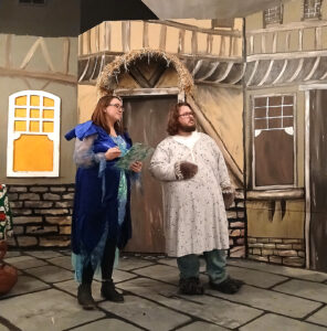 Merriwether (Megan Peterson) and The Big Bad Wolf (Brandon McAtee) rehearse for Hawkeye Community Theatre’s upcoming show, “A Fairy Tale Christmas Carol,” which begins Wednesday.