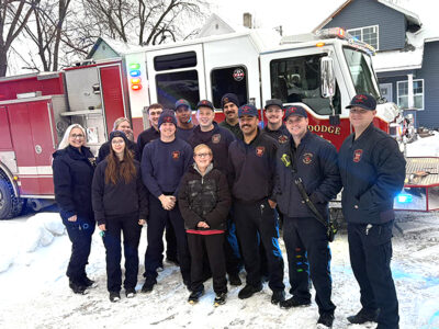 Colton Holmes, center, was accompanied to school by the members of the Fort Dodge Fire Department who responded to a fire and were assisted by his previous work to clear snow away from a hydrant. They are, from left, Paramedic Andrea Brandt, EMT Katelyn Rodenborn, Firefighter/EMT Taryn Sutton, Firefighter/EMT Zach Rossmanith, Firefighter JJ Durflinger, Firefighter/ Paramedic Mychal Edler, Firefighter/Paramedic Kyle Porter, Lt. Jon Schrek, Firefighter Gionni Hamilton, Firefighter/ Paramedic Aaron Campbell, Lt. Devon Schuster, and Firefighter/ Paramedic Stephan Cook.
