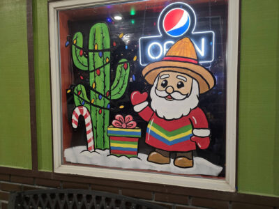 Santa is ready for the holidays in the windows of El sol de Mexico restaurant in Humboldt. Kelsey Olson painted Santa along with a gift and cactus in one window of the business, and a festive taco and beverages in another.