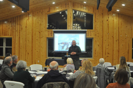 Members of the Friends of Webster County Conservation listen to a presentation by Matt Cosgrove, director of Webster County Conservation, Thursday evening during the group’s annual meeting and dinner.