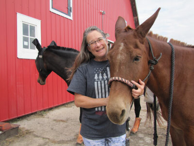Richenda Cripe stands with one of her mule friends at the family’s Dayton area farm. She and her husband have converted the barn into a home for their three mules.