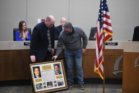 Former Fort Dodge Mayor Matt Bemrich, right, receives a framed collage of photos from his time as mayor. City Manager David Fierke, left, presented it to him. Fierke said a copy of it will hang in the City Council meeting room.